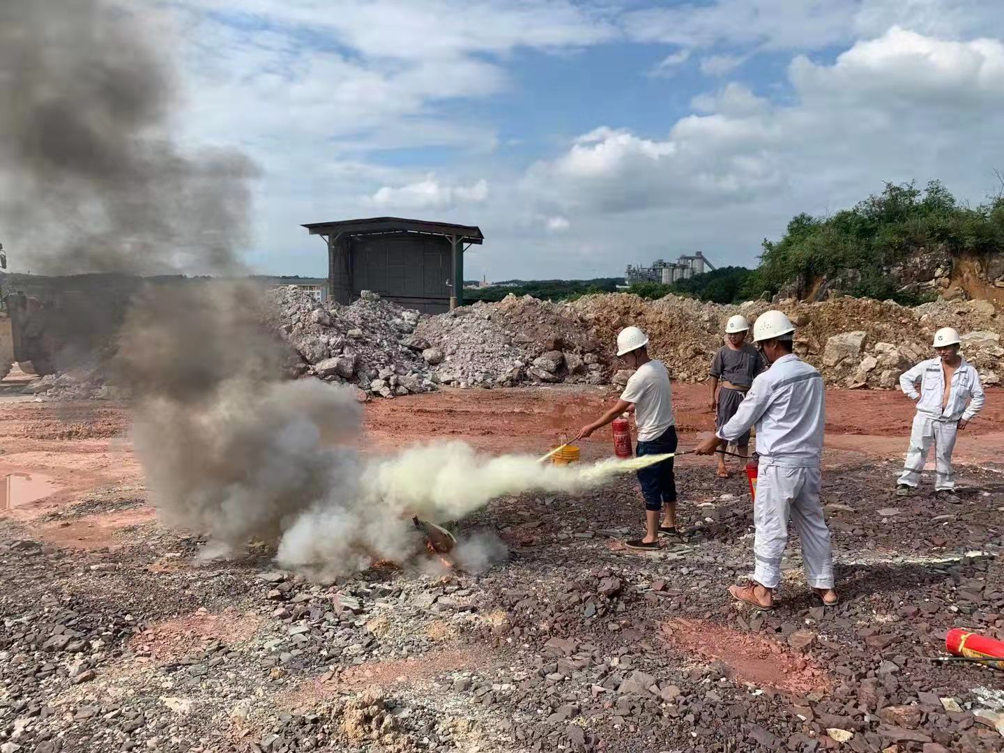 安全宣講階段:礦山專(zhuān)職安全員對(duì)此次消防演練的目的及消防演練的重要性進(jìn)行了傳達(dá)貫徹,并向員工說(shuō)明了滅火器的使用方法、滅火器的種類(lèi)和滅火類(lèi)型,滅火注意事項(xiàng),并就如何使用滅火器補(bǔ)救初期火災(zāi)等進(jìn)行了現(xiàn)場(chǎng)示范。